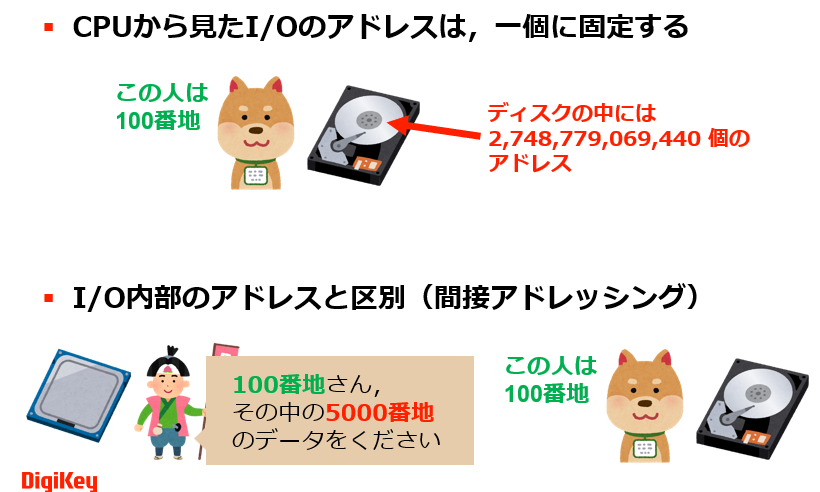 アドレスの割り当ては,単純に1つのアドレスだけで指定する方法だけでなく,2段階の指定方法もあります.これにより,ハード・ディスクの交換時でもCPUから見たアドレスが変わらないようにできます.たとえば,