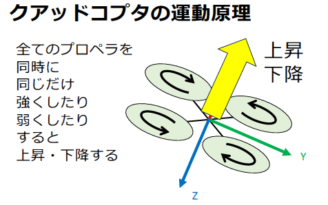 上下方向の運動は,4つのプロペラが発生する推力の総和によって制御されます.
