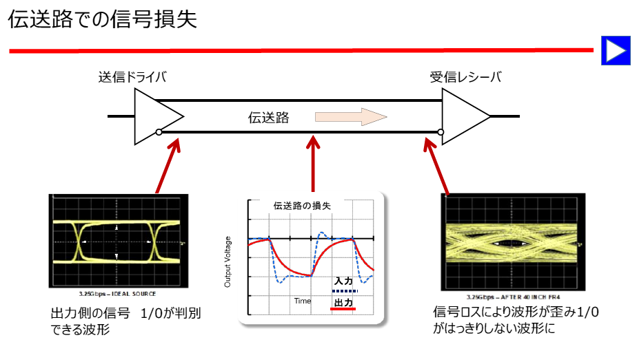 高速シリアル伝送で使用されるJESD204規格では,データ伝送の品質確保が設計の要になります.10Gbps以上の高速伝送においては,信号は伝送路を通過する間にさまざまな損失を受け,送信側の意図した矩形波形が受信側で著しくひずんだ形になります.これが伝送損失です.