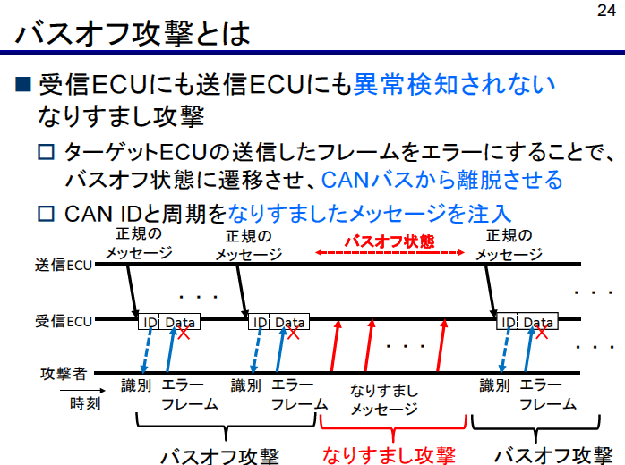 バスオフ攻撃では,ターゲットECUが送信したフレームを連続してエラーにすることで,送信ECUをバスオフ状態に遷移させ,CANバスから離脱させることが可能です.この手法により,攻撃者は正規のCANメッセージをなりすまし,車両制御を行うことができます