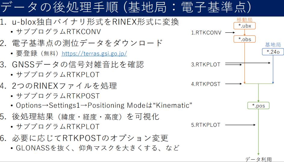 - RTKPOST:RINEXファイルを用いて後処理を実施する