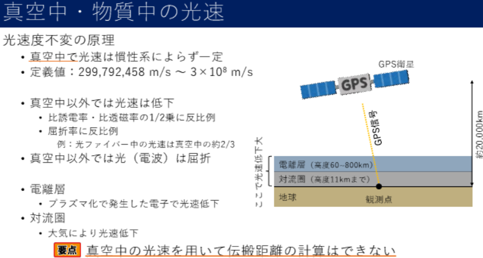 GPS測位で重要なのは,GPS衛星から発せられた信号が地表の受信機に到達するまでの時間です.この到達時間を基に,距離や位置を計算します.信号は光速で伝わると理解されがちですが,実際には真空中とは異なり,地球の大気を通過する過程で光速が低下する現象が生じます.