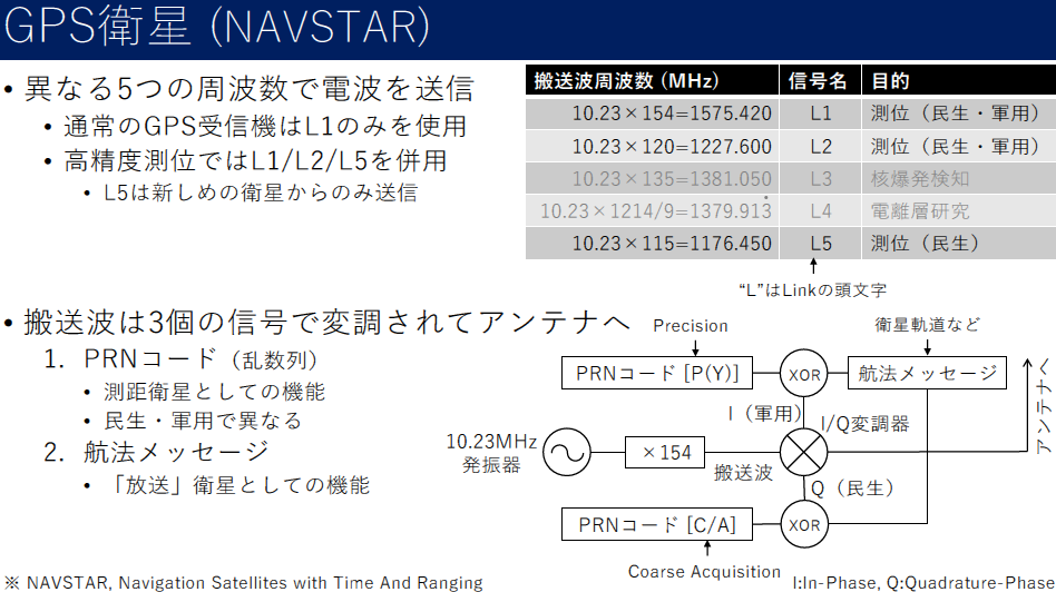 NAVSTARは5種類以上の異なる周波数帯で電波を送信しています.測位に直接使われるのはL1,L2,L5の3チャネルで,L3とL4はそれぞれ核爆発検知や電離層観測といった目的に利用されます.