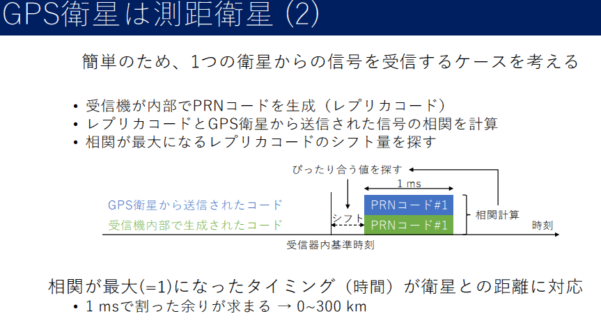 たとえば,PRNコードと呼ばれる擬似ランダム信号は,1 msの周期をもち,その1周期で光が進む距離は約300 kmになります.受信機はこのPRNコードを内部で生成し,衛星からの信号と相関を取って一致する時刻を検出します.このときのシフト量が擬似距離に対応します.