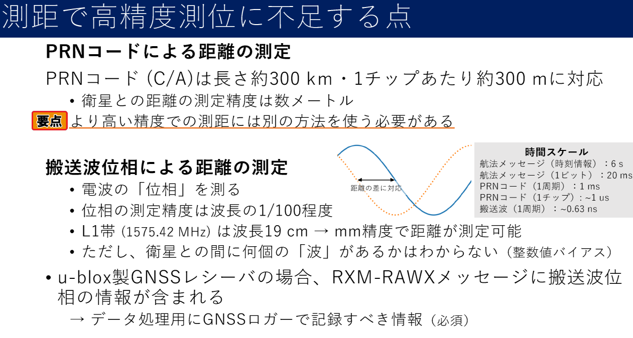 GNSS測位の基本はPRNコードによる距離測定です.PRNコードはおよそ300 kmの長さをもち,それを1000チップに分けて1チップあたり約300 mに相当します.このコードに基づく距離測定では,受信機の精度により数m程度の位置精度が得られますが,数cmや数mmといった高精度な測位には不十分です.