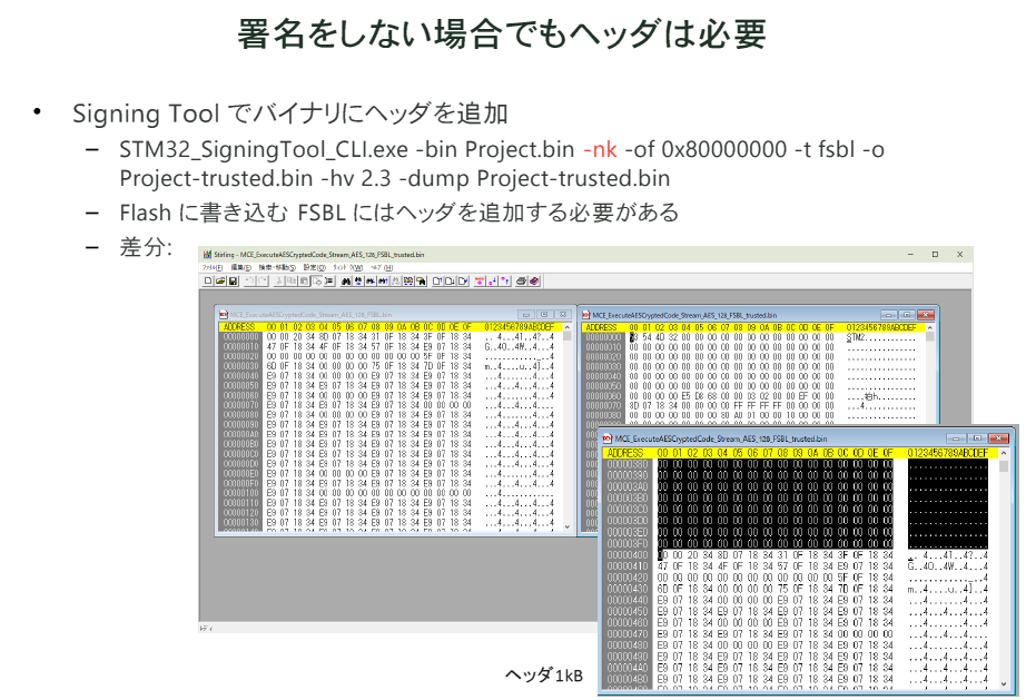 このプロセスによって,改ざんされたコードはブート段階で拒否されるため,信頼できる実行環境が維持されます.署名を行わない場合でもヘッダの付与が必要であり,Flashに書き込むすべてのコードは検証可能な形式で準備する必要があります.