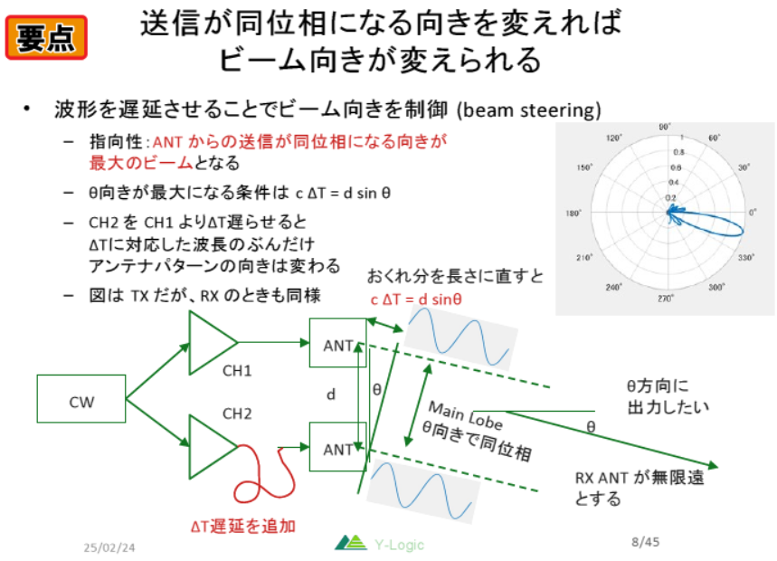 従来は電波の進む時間を遅延させることでビームの方向を制御していました.複数のANT間でΔTの遅延を追加すると,その遅延に対応した波長の分だけANTパターンの向きが変わります.RXでも同様の原理で受信方向を制御できます.