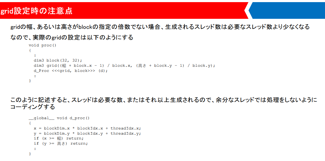 これにより,計算結果が必ずしもブロックの倍数と一致しない場合でも,無駄なスレッドを追加することなく必要なスレッド数を正確に割り出すことができます.
