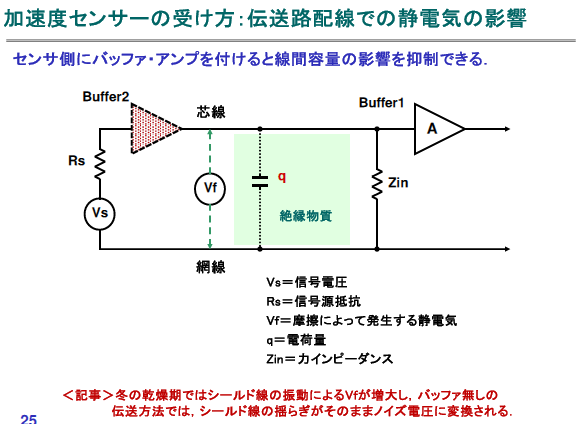 冬場の乾燥した環境では,シールド線が振動すると摩擦によって静電気($V_f$)が発生し,これがノイズ源となることがあります.この静電気ノイズは,圧電型加速度センサが出力する信号電圧($V_s$)と伝送路の寄生容量によって影響を受けます.信号源抵抗($R_s$)が高い場合,これらの要因が複雑に絡み合い,ノイズが増幅されることがあります.