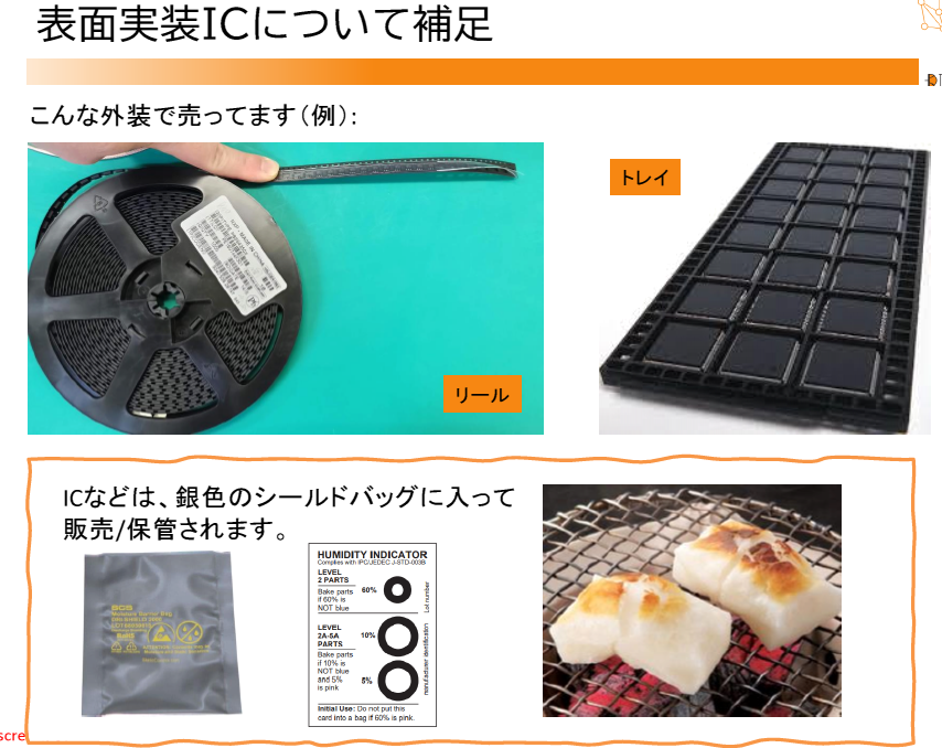 図1 表面実装ICはリールやトレイ,銀色のシールド・バッグなどに梱包される.パッケージ内には乾燥剤が同梱され,内部の水分を吸収する.画像クリックで動画を見る.または記事を読む.[提供・著]善養寺 薫