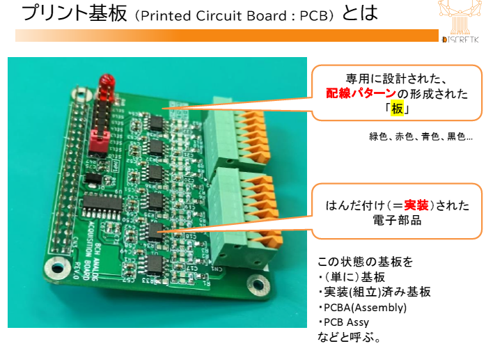 基板や実装済み基板の呼び名は,業界や企業によって異なります.代表的にはPCBA,PCB Assy,Assemblyなどです.実装という用語は,部品を基板に取り付けてはんだ付けする工程を指します.初めて学ぶ際はこれらの用語に慣れておくと理解がスムーズです.