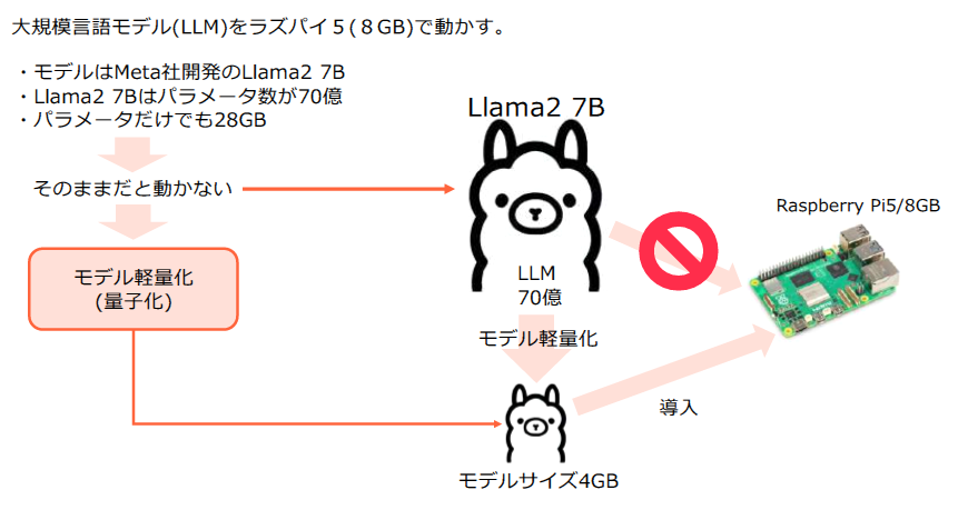 エッジ・デバイスでは、自動運転やスマートホームなど、リアルタイム応答が求められるシナリオが多いです.しかし、Raspberry PiのCPU性能は限られており、Llama2 7BのようなLLMをそのまま動かすことは難しいため、モデル軽量化が必須です.