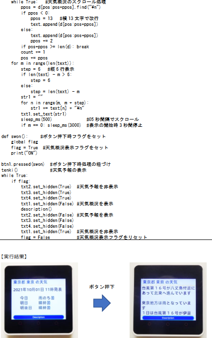 2. APIデータの取得:`urequests`ライブラリを使って,天気予報APIから必要なデータを取得します.例えば,地域名,天気概況,予報日時を取得して画面に表示します