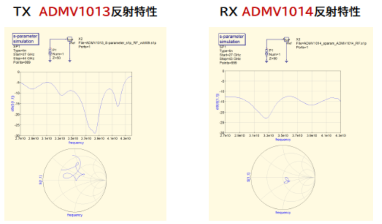 アップコンバータ ADMV1013 の反射特性は,特定周波数を重視するのではなく,広帯域でバランスの取れた動作を目指しました.誘導性に触れている特性を容量性へ引っ張っています.