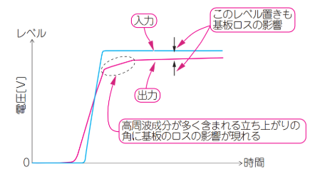 基板ロスの影響は,高調波成分に顕著に現れます.高周波成分ほど減衰が大きく,波形の立ち上がりが鈍くなります.基板ロスの影響を抑えるためには,以下のような手法が考えられます.