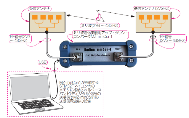 アップコンバージョンを行うことで,既存のSDRや無線機でもミリ波帯の通信を可能にし,ダウンコンバージョンを活用することで,ミリ波帯の受信信号を解析しやすくなります.