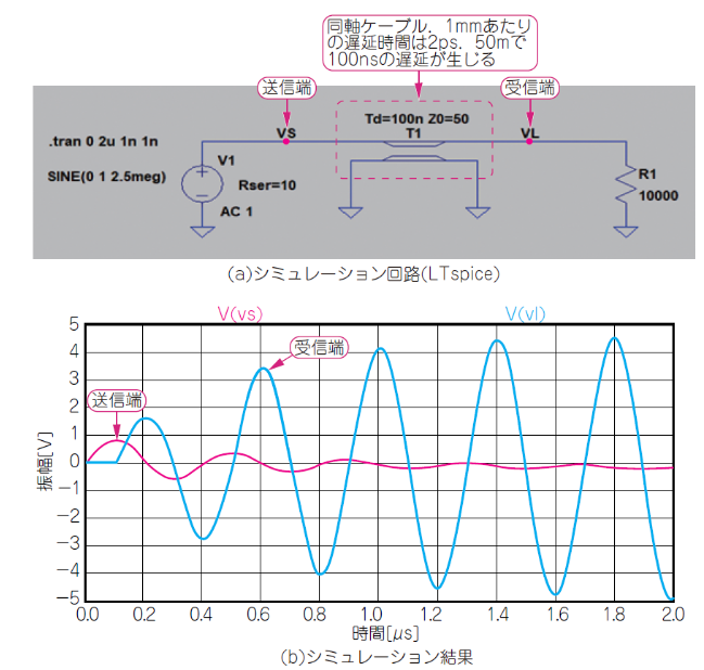 反射が起きると,信号の波形に変化が生じます.送信端が50$Omega$,受信端が開放された場合,伝送線路の特性インピーダンスと一致しないため,反射が発生します.このとき,送信端で送られた信号が反射して戻り,入力信号と合成されることで波形が変化し,最終的に1Vに収束します.低速のディジタル回路では,反射の影響は目立ちませんが,波形が急激に変化しないため,波長が大きくなると反射の影響が顕著に現れます.