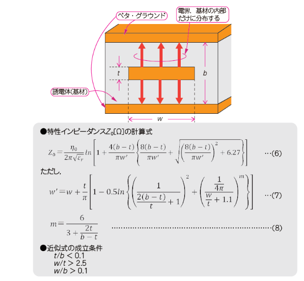 ストリップ線路は,主にプリント基板に用いられる伝送線路で,その特性インピーダンスは,導体の厚さと幅,基板の厚さによって決まります.基板の厚さが小さくなり,導体厚みと幅の比が小さい現代では,近似式を用いた計算が重要です.ストリップ線路はクロストークが発生しにくい構造をしており,高密度な回路に適していますが,誘電損失や銅損失が比較的大きいという欠点もあります.