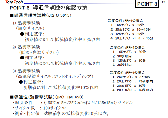 熱衝撃試験以外にも,導通信頼性を評価する方法はいくつかあります.高温環境に基板を長時間さらす恒温試験や,高温オイルに基板を浸して導通状態を観察する方法などもあります.いずれの方法も,JISやIPCなどの規格に準じて行われます.特にIPCでは,国際的に統一された評価基準が設定されており,製品の信頼性比較に用いられます.