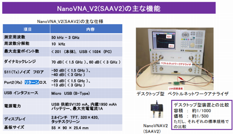 NanoVNAV2(SAAV2)は,小型で手軽なベクトルネットワーク・アナライザであり,最大3GHzまでの高周波測定が可能です.従来のデスクトップ型ベクトルネットワーク・アナライザと比較して,約1/1000の容積と1/500の価格で同様の機能を提供します.NanoVNAV2は,リターン・ロス($S_{11}$)や通過ゲイン($S_{21}$)の測定に適しており,電源供給はUSBから行われるため,ポータブルで便利な測定ツールとして広く活用されています.