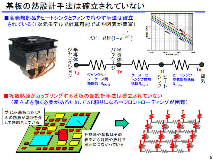 プリント基板上には複数の熱源が存在し,それぞれが基板を介して熱結合しています.熱源からの熱は基板表面から周囲の空気や筐体に放出されます.単一の高発熱部品では,ヒートシンクやファンを組み合わせることで1次元モデルでの計算が可能です.ジャンクションからケース,ケースからヒートシンク,ヒートシンクから空気への熱経路は直列の熱抵抗として扱うことができ,トータル熱抵抗と温度差の計算は比較的容易です.