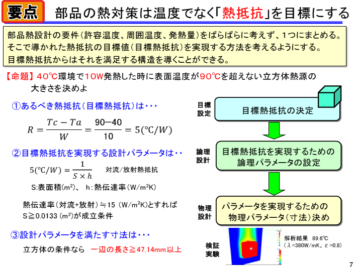 熱設計を開始する際には,まず発熱条件を整理し,全熱源に対して許容される熱抵抗を算出します.たとえば,周囲温度が40℃で,発熱量が10Wの立方体デバイスがあるとします.部品温度を90℃以下に抑える必要がある場合,温度上昇の許容幅は50℃です.このとき,1Wあたりに許容される温度上昇は5℃であり,目標熱抵抗は5℃/Wです.この値が設計上の基準になります.