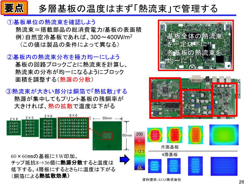 熱流束が局所的に大きい場合は,銅箔を利用して熱を拡散させることが有効です.基板の残銅率を高くすれば,熱が面全体に広がり温度上昇を抑制できます.チップ抵抗などを分散配置することでも温度を下げられます.さらに,多層基板にして銅箔を増やすことで,放熱性能は向上します.このような工夫を組み合わせれば,基板自体が放熱デバイスとして機能します.