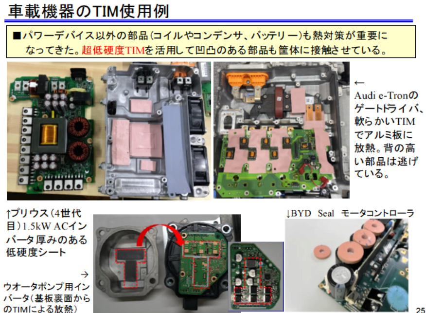 インダクタやキャパシタのように平らでない部品も,柔らかいTIMを用いることで筐体と接触させて放熱可能です.車載インバータやモータ・コントローラでは,各部品に適切にTIMを配置し,背の高い部品は逃げる設計が採用されています.この手法により,放熱効率を確保しつつ,部品の安全性や機能を損なわない冷却が実現されます.