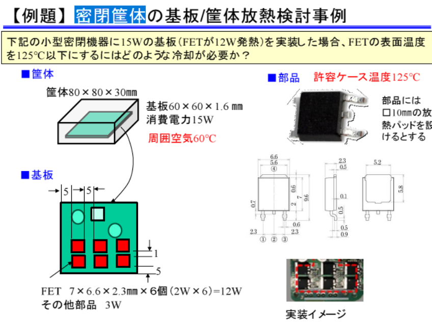 小型密閉筐体に15W程度の基板を実装する場合,部品から発生する熱を効率的に筐体へ逃がすことが重要です.消費電力の大半はFETが占め,6個で合計12Wを発熱します.周囲空気温度が60℃の場合,筐体や基板の熱設計を誤ると部品温度が125℃を超えるため,自然空冷だけでは十分な冷却ができません.