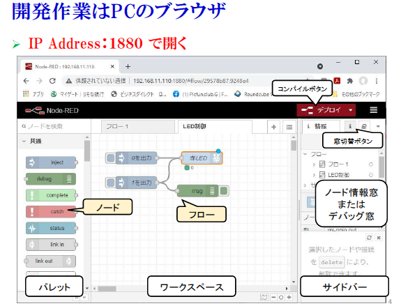 - パレット:プログラムの要素となるノードが配置されており,必要に応じてインターネットから追加できます