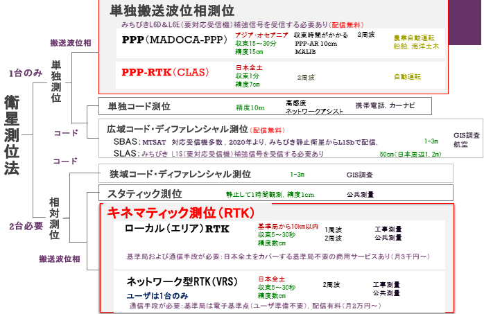 - RTK(リアルタイム・キネマティック):基準局と移動局の2台で測位.精度数cm,収束時間5~30秒