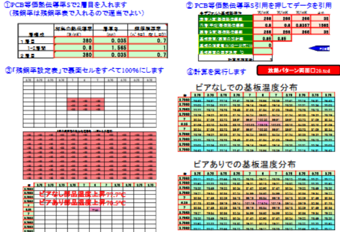 Excelを用いたシミュレーションでは,銅箔率や層構成を変えた場合の温度上昇を数値的に評価できます.たとえば,片面基板の残銅率を100$%$にした場合と50$%$にした場合の部品温度上昇を比較することで,最適な設計指針を導き出せます.