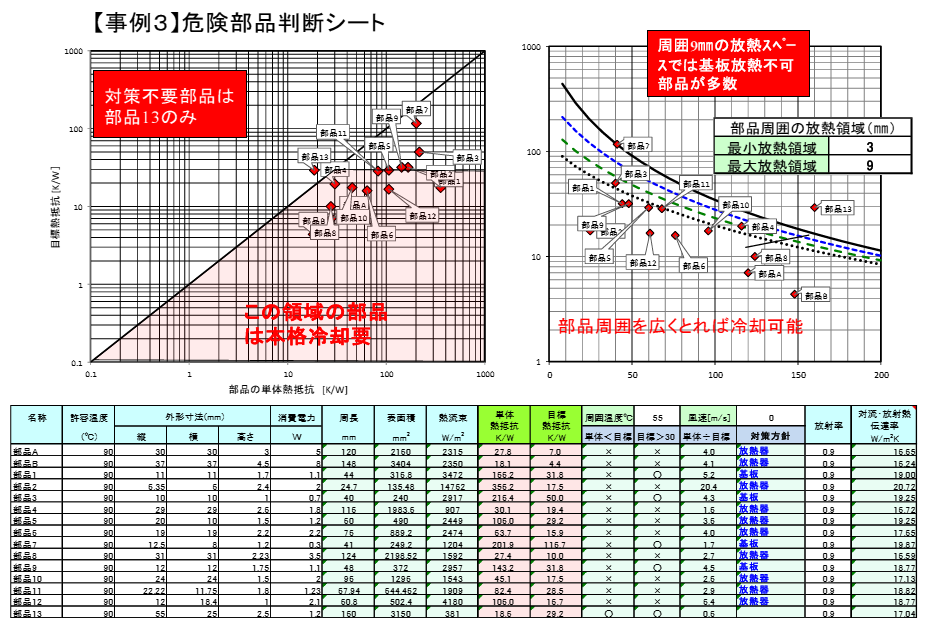 部品A(30mm×30mm×5mm,消費電力5W)を考えます.この部品は周囲9mmの放熱スペースでは基板冷却が困難であり,ヒートシンクの使用が推奨されます.一方,部品13(55mm×25mm×2.5mm,消費電力1.2W)は適切な基板配置により追加の放熱対策を必要としません.