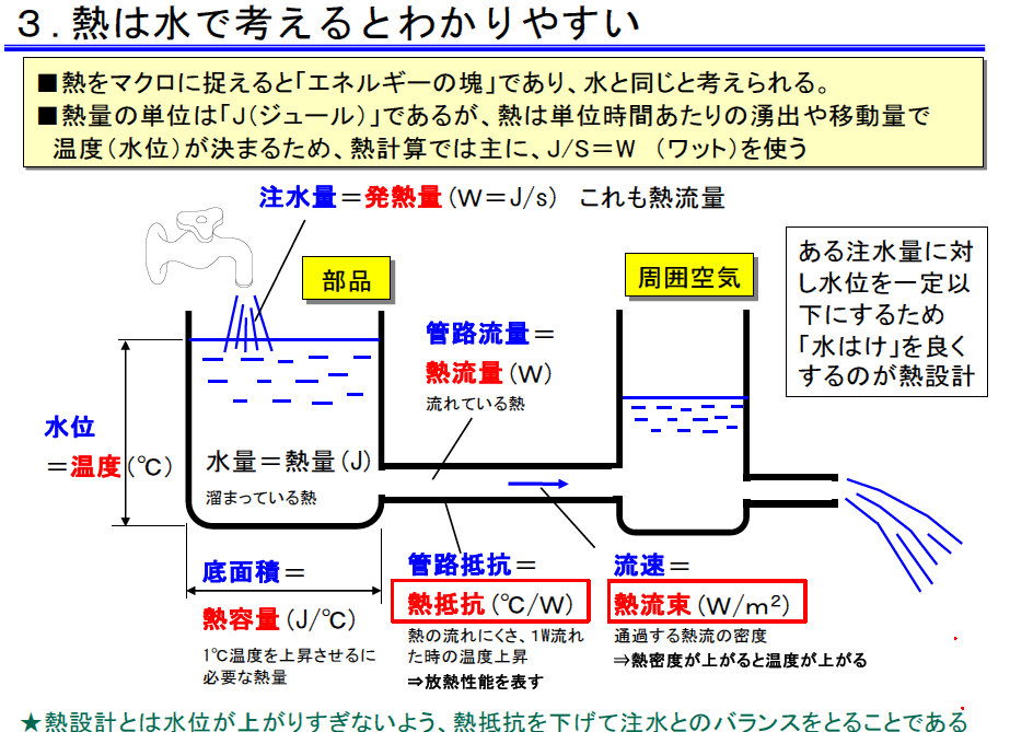 熱の流れを理解する際,水の流れに例えると直感的に把握しやすいです.熱はエネルギの一形態であり,時間当たりに移動する熱量(熱流量)は,配管を流れる水量に相当します.熱設計を考える際,以下のような対応関係が成り立ちます.