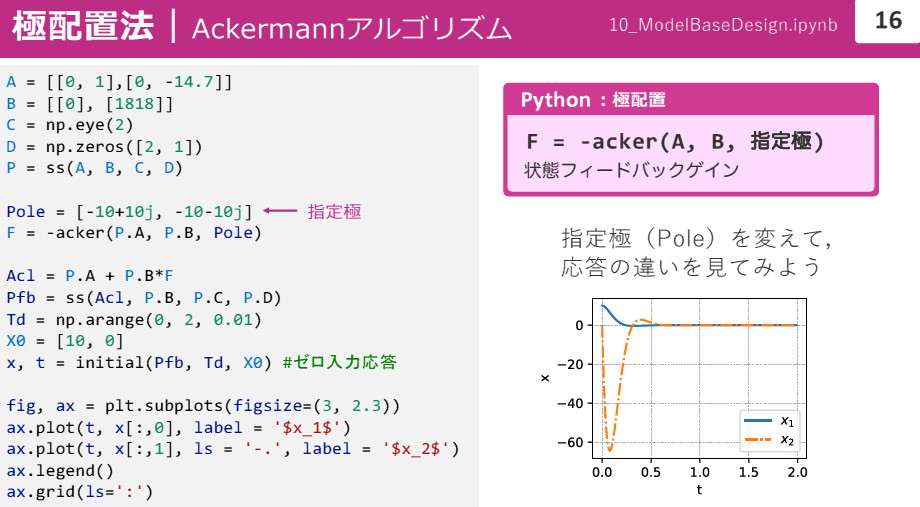 極配置の代表的な手法の1つにAckermann関数を用いた方法があります.この方法では,制御対象の行列$A$と入力行列$B$を用いて,特定の極を設定し,状態フィードバック・ゲイン$F$を求めます.