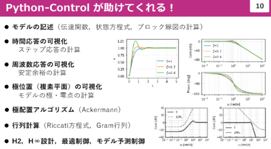 Python-Controlは制御工学の計算やシミュレーションをPython上で実行するためのライブラリです.時間応答の可視化,ステップ応答や周波数応答の計算,安定余裕の評価などを簡単に行えます.伝達関数や状態方程式,ブロック線図といったモデルの記述も可能で,極や零点の解析,極配置アルゴリズム(Ackermann)やリッカチ方程式,H2/H∞制御設計,モデル予測制御まで幅広く対応しています.これにより,教科書や演習で学ぶ制御理論を実際の数値計算やシミュレーションで確認できます.