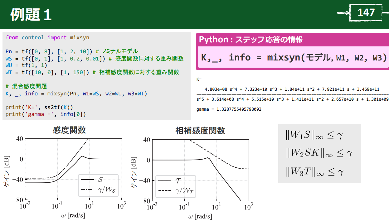 実際のロボティクス・システムでは,複数の制御目標が相互に競合することがあります.例えば,低周波数帯では外乱の抑制が重要ですが,高周波数帯では目標追従が優先されることが多いです.このような場合,「混合感度問題」を解くことで,外乱抑制と目標追従のバランスを取ることが可能になります.混合感度制御では,感度関数 $S(s)$ や相補感度関数 $T(s)$ に重みをつけ,それらのバランスを最適化します.