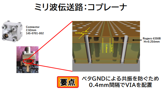 たとえば42GHzに対しては波長が約7mmとなり,この1/10以下である0.4mm間隔でビアを配置すれば,24GHzから44GHzの範囲で共振は発生しません.