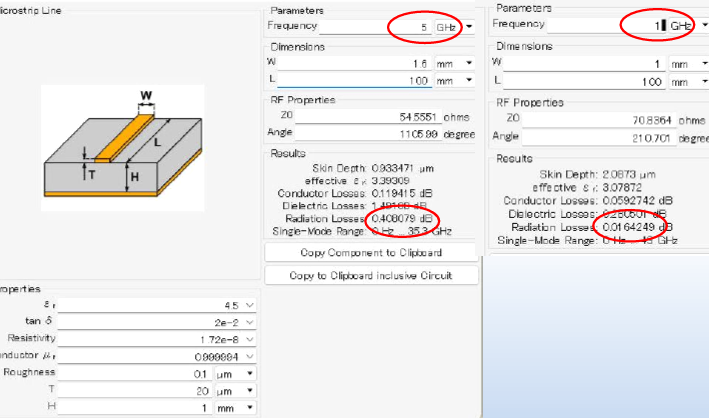 実測あるいはシミュレーションの結果として,周波数1GHzでは放射損失は約0.01dBと小さいですが,