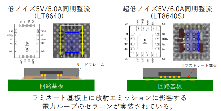 LT8640Sは,LT8640の進化版であり,パッケージ内にセラミック・キャパシタを内蔵することで電力ループのインダクタンスを低減し,損失を10~20%削減しています.これにより,5A出力から6A出力への性能向上が実現されています.