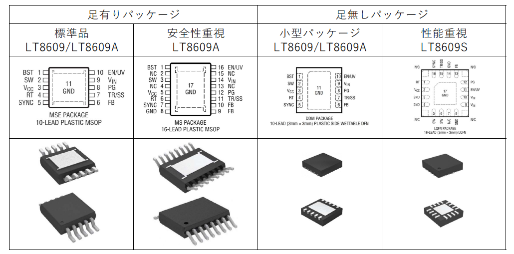スイッチング電源ICでは,用途に応じたパッケージ選択が重要です.LT8609シリーズには以下のようなパッケージ・オプションがあります: