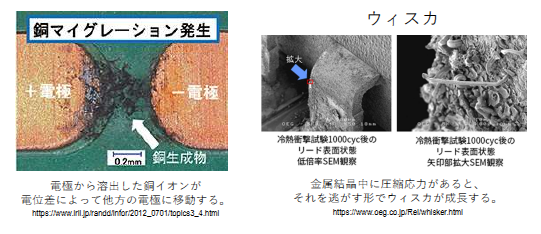 銅マイグレーションは,高湿度環境下で電極から溶出した銅イオンが電位差によって移動し,別の電極側に固着する現象です.この現象は長時間電圧が印加されている基板で特に問題になります.銅イオンが移動して固着すると,隣接する端子間でブリッジが形成され,ショート故障を引き起こします.