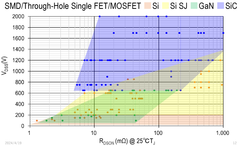 - 650V~1200V:GaNやSiCが入り混じる領域.用途に応じた選択が重要
