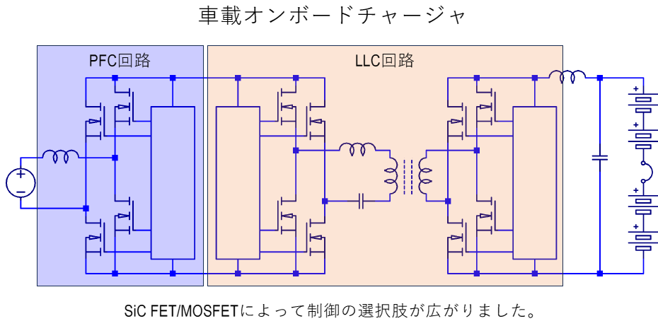 これらの要素によって,車載チャージャの小型・軽量化,冷却系の簡素化が進められています.トーテムポールPFCやLLC回路において,SiCやGaNは既存Si FETに対し,技術的優位性を発揮します.