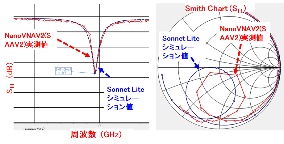図1 Sonnet Liteによる電流密度分布表示 図2 Sonnet LiteによるSパラメータ・シミュレーションとNanoVNAV2による測定結果の比較