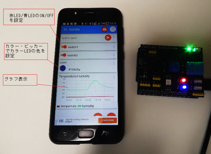 | 写真4 スマートフォン上のIoTMQTT PanelアプリでLEDをON/OFFしたり,温湿度センサ情報をグラフ表示したりしているところ | 写真5 BLEと,スマートフォン上のBluefruit Connectアプリを使って,ボード上のLEDをON/OFFしているところ | 写真6 Wi-Fiサーバ機能付きネットワーク温湿度計 |