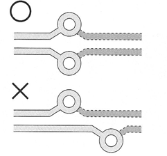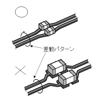 図1 差動ビアは線路方向にずらさず配置する 図2 高速ラインのパターン幅とチップ部品の幅を合わせる 写真2 ブレークアウト部のパターン…分岐後の長さはできるだけ短くし,線路長も合わせる
