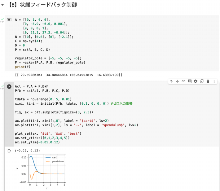 図2 状態フィードバックによるレギュレータ制御と極配置法 図3 WEBブラウザ上で動作する開発環境Jupyter Notebookで状態フィードバック制御のPythonプログラミングを実行しているところ