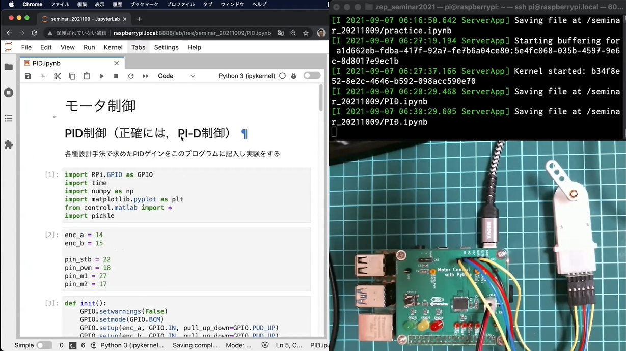 センサとアクチュエータのしくみとコンピュータのつなぎ方から,制御の基礎とモータのPID制御,モデルべースの制御器設計まで丁寧に説明します.Pythonによるモータ制御系の設計方法や実装方法を体験することができます.