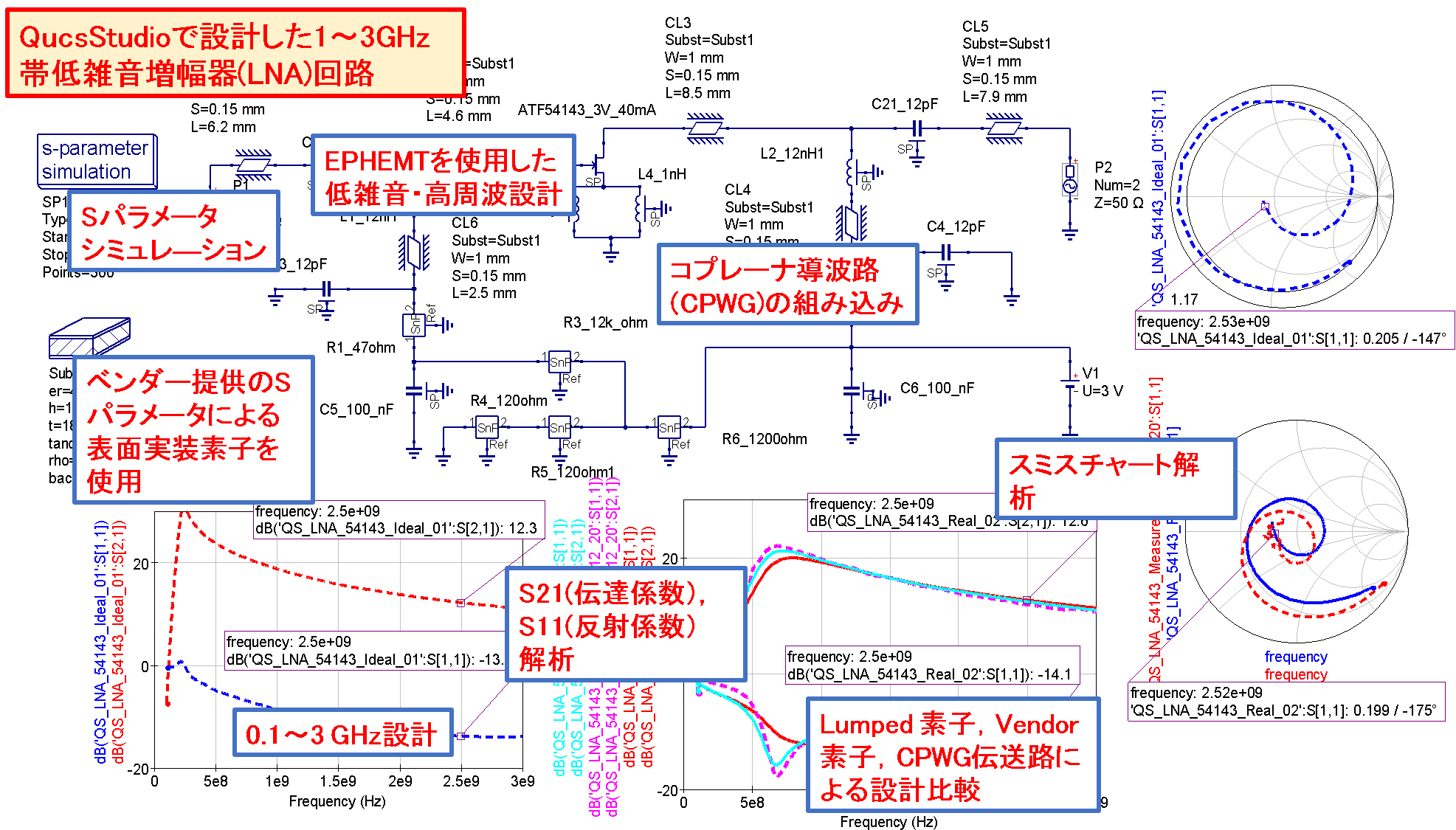 集中定数回路からSパラメータ/コプレーナ線路を組み込んだ回路,NanoVNAV2による測定値の表示用回路まで,QucsStudioで動作する回路ファイルを6種類提供します.